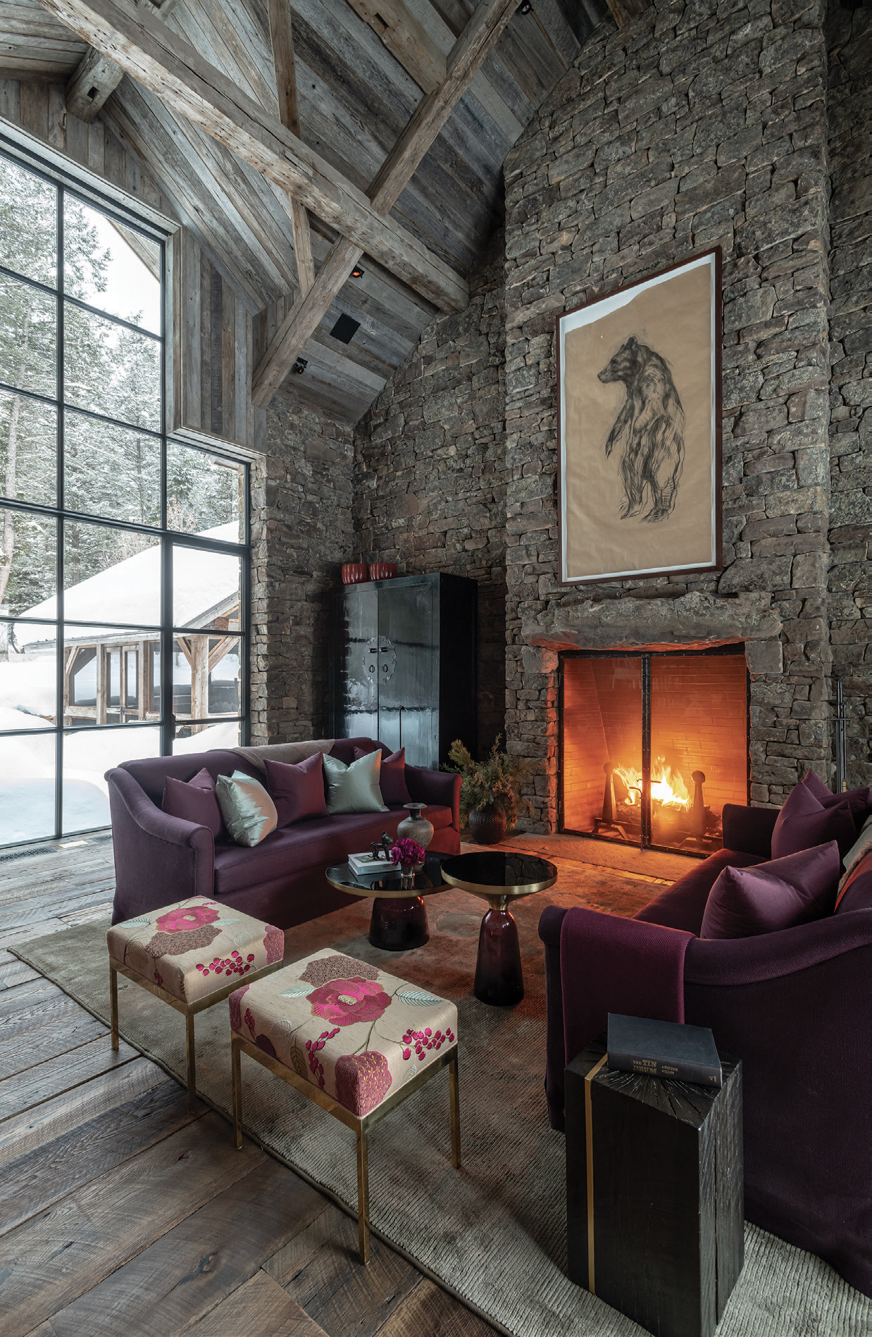 Designers Tayloe Piggott and John Thorkildsen, of the Jackson Hole-based Tayloe Piggott Design, helped execute the interiors, choosing a warm color palette that included eggplant, blues, and rich browns. “I have huge respect for the architecture and materials; they always heavily influence the language,” Piggott says. “The goal was to keep things so they were all in conversation with each other. We also wanted it to feel like it had been lived in and that it wasn’t all new.”