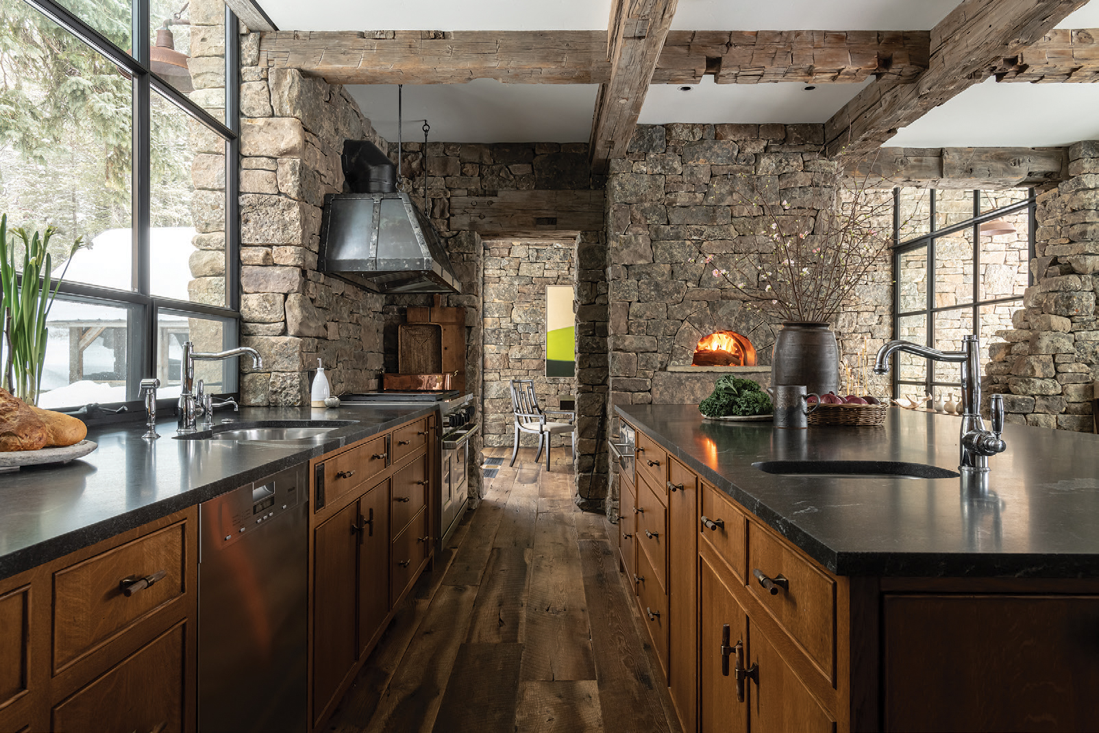 - The kitchen features a wood-burning pizza oven, distressed white oak cabinetry, honed granite countertops, and a custom iron range hood by the Jackson Hole-based Heart Four Ironworks.