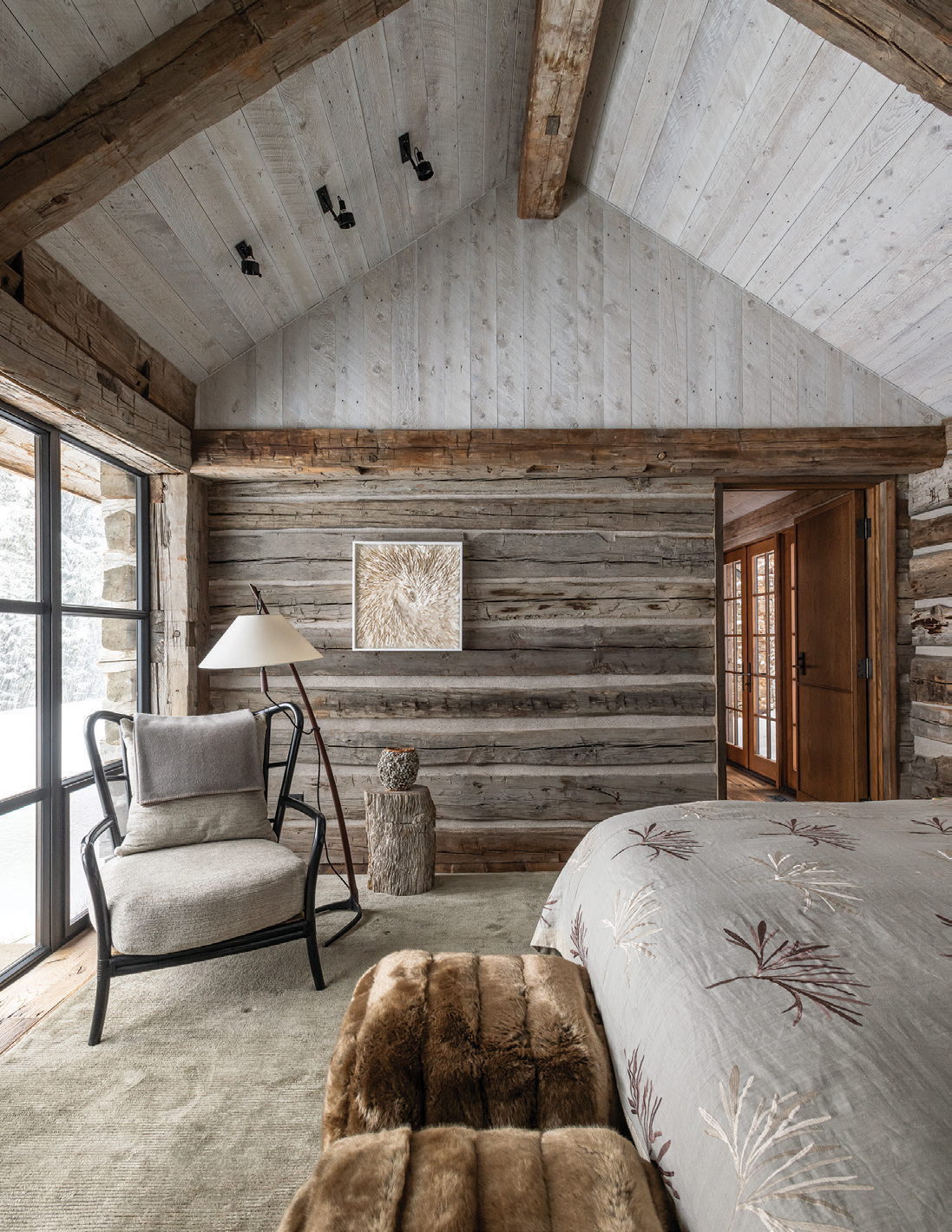 - The homeowners’ bedroom was constructed from a reclaimed cabin and features a chair from McGuire Furniture upholstered in Laura Lienhard fabric, artwork by Rakuko Naito, and a petrified log stump, sourced from Susanne Hollis Antiques, that makes for a sturdy end table.