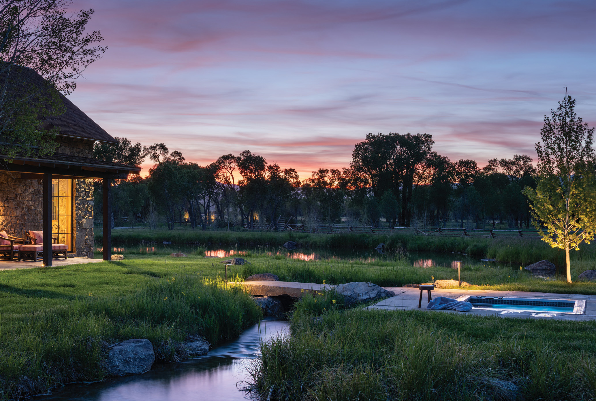 The structure does inhabit its site in a way that is both unique and appropriate to setting. Every space has a strong relationship to the outdoors. In both the living area and primary bedroom, dramatic curved timbers and floor-to-ceiling windows frame a mountain view, the pond in the foreground reflecting the drama of the sky. The primary bathroom juxtaposes a white vessel tub against a stone wall. An adjacent private terrace leads to a stone bridge spanning a stream to a spa set into a grassy expanse. The chef’s kitchen, with its farmhouse sink, custom-forged hood, and large wood-topped island, opens directly to a dining terrace. A screened porch furnished with rustic seating blurs the line between indoor and out.