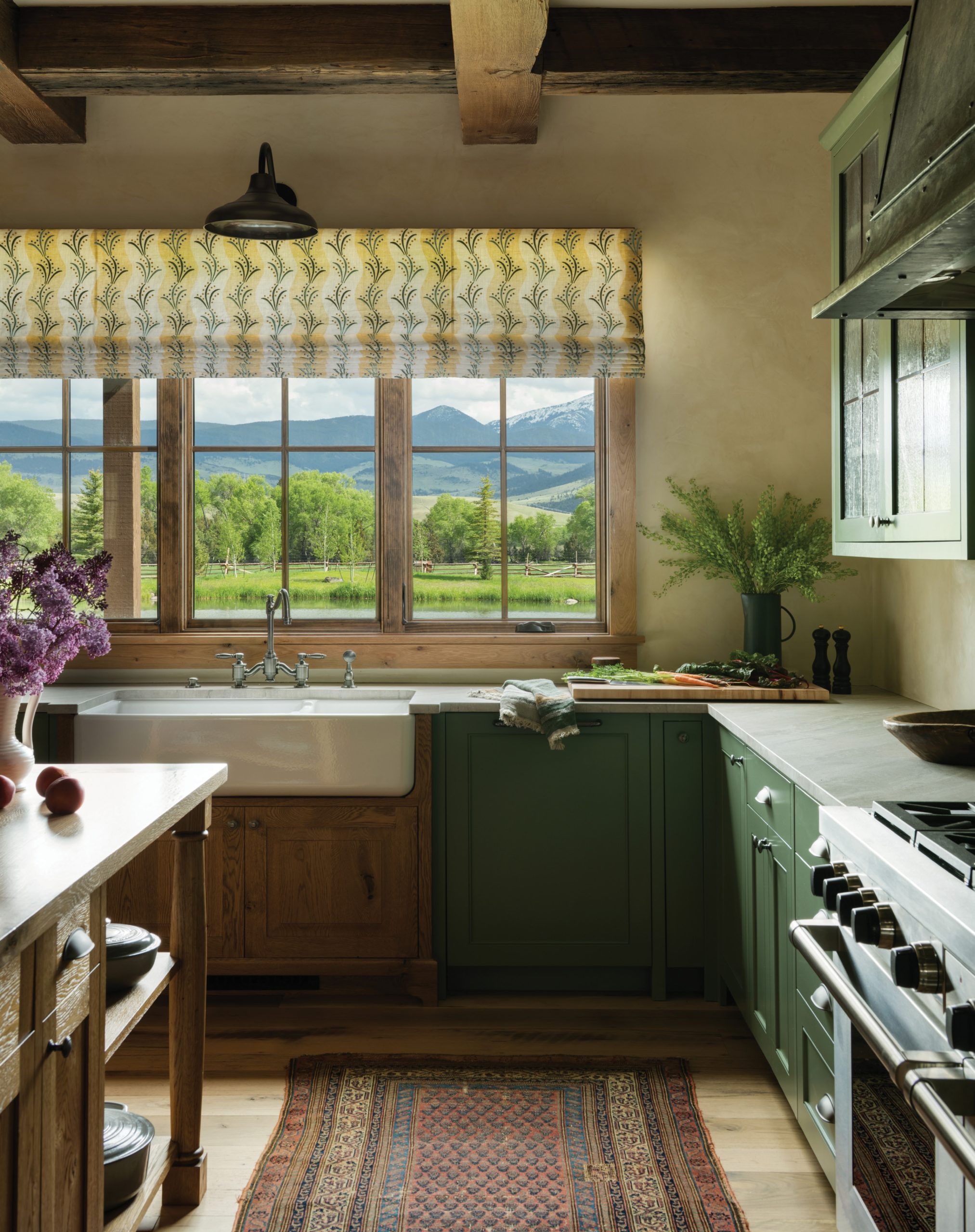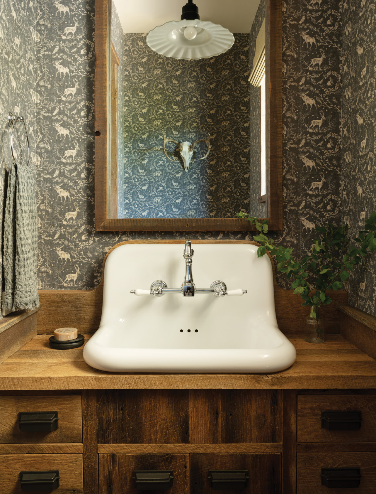 The furnishings are sturdy but have warmth and patina. The farmhouse structure leans toward country antiques, high-quality rugs, and sometimes whimsical wallpapers that speak to the flora and fauna outside the windows. The great room is dominated by reclaimed hewn wood with timber framing, while the adjacent kitchen has plaster walls, a coffered-beam ceiling, and painted cabinets, some with panels of punched tin. The charming guest bathroom has a vintage feel, with beadboard walls and a white porcelain vessel sink atop a custom painted vanity. “The central volume is absolutely turn-of-the-century Montana farmhouse,” Fedro says.