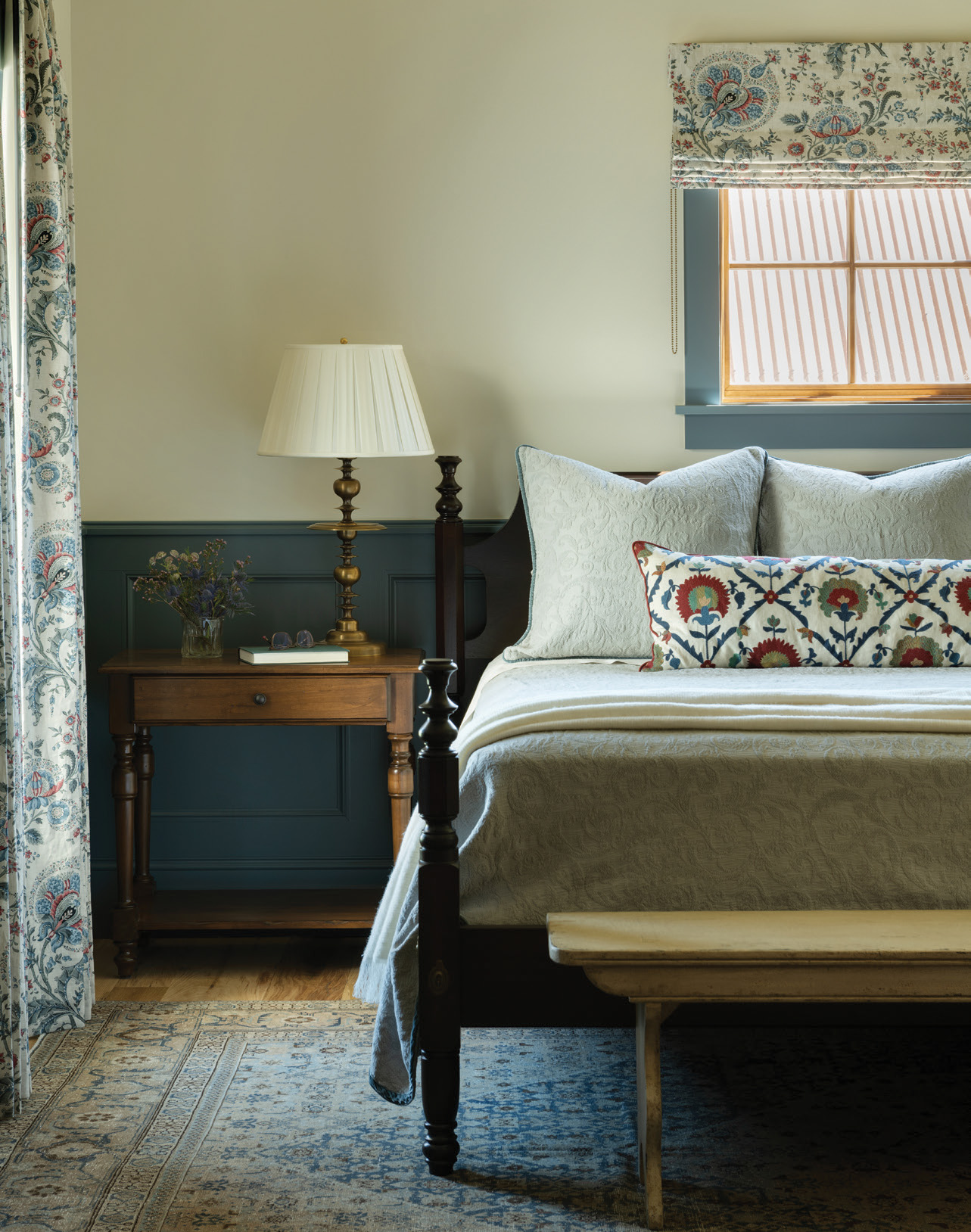 A quiet guest bedroom in the farmhouse invites repose. “When we built the house,” says the owner, “one of my edicts to Laura and the Yellowstone Traditions folks was, whenever possible, to buy things that were made in the U.S.