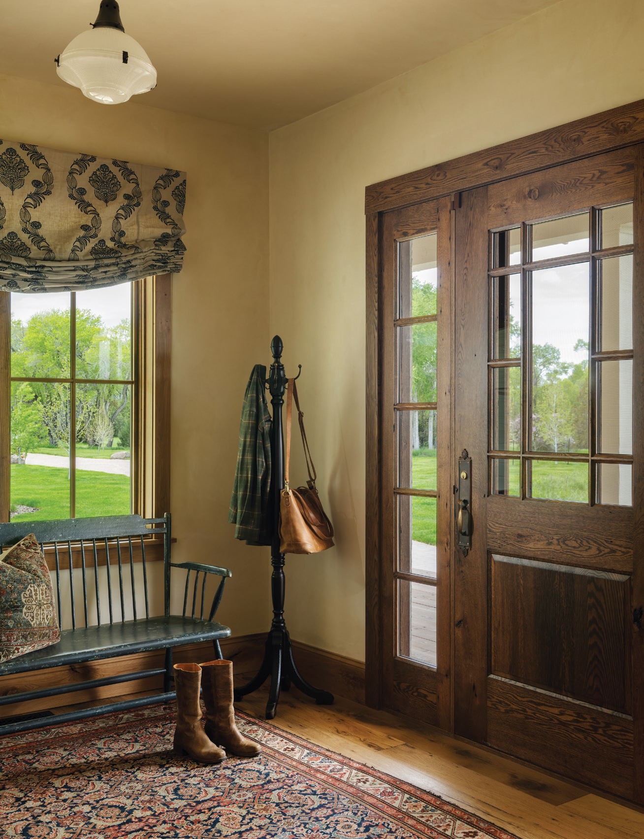 For the central wood-clad volume of the home, the owners and interior designer Laura Fedro agreed that the rooms should have the feel of a true Montana farmhouse, in deference to the agricultural traditions of the community and the property’s own ranching pursuits.