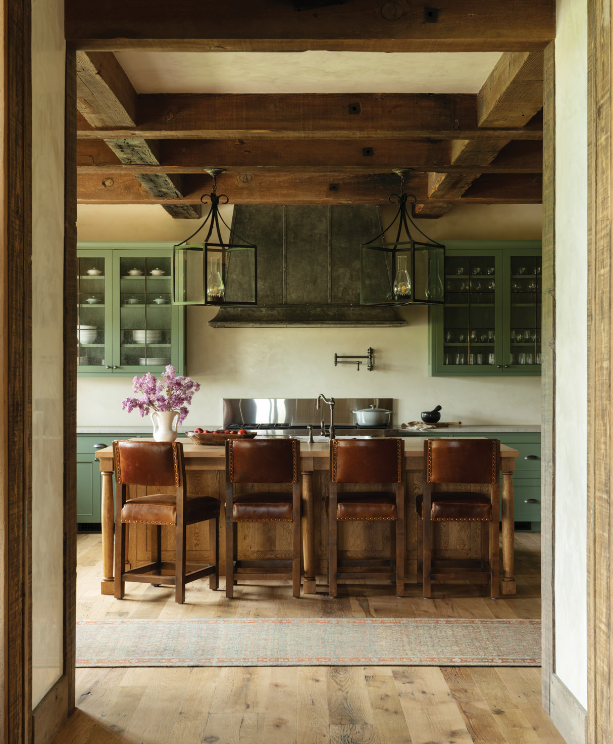 To support the owners’ aim of a home that feels discovered, Fedro kept the interiors simple and clean aesthetically, which allows the textural element of reclaimed materials to shine. The kitchen’s plaster walls and painted cabinets meld seamlessly with the coffered-beam ceiling, patinated range hood, and warm tones of the island and leather bar stools.