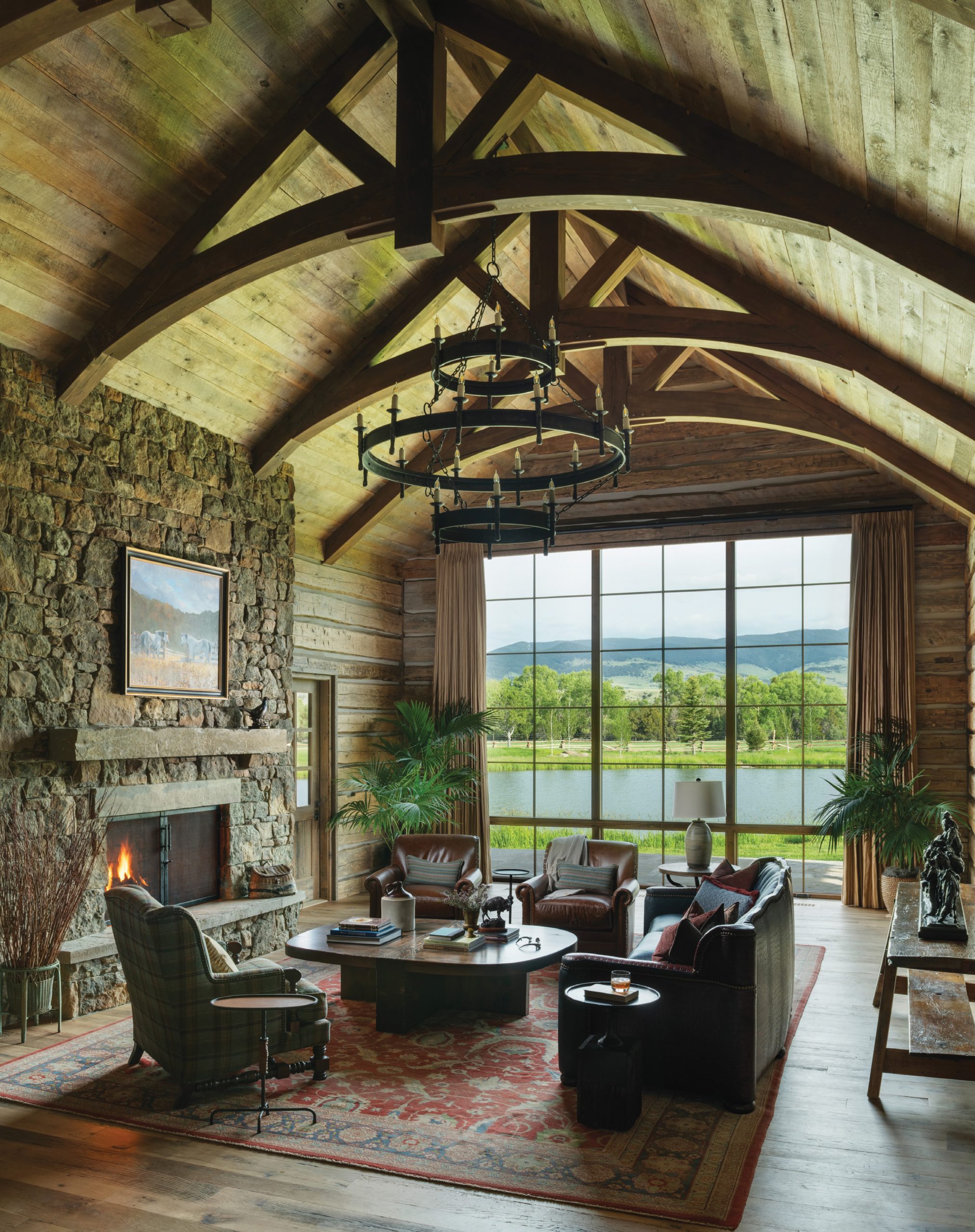 A dramatic but human-scaled timbered great room — with its floor-to-ceiling windows overlooking a pond and taking in mountain views — is the ultimate blend of rustic and contemporary. The iron light fixture was made by Carl Pearson at IronGlass Lighting. All the seating in the great room was custom designed by Laura Fedro Interiors and built by their custom upholstery shop.
