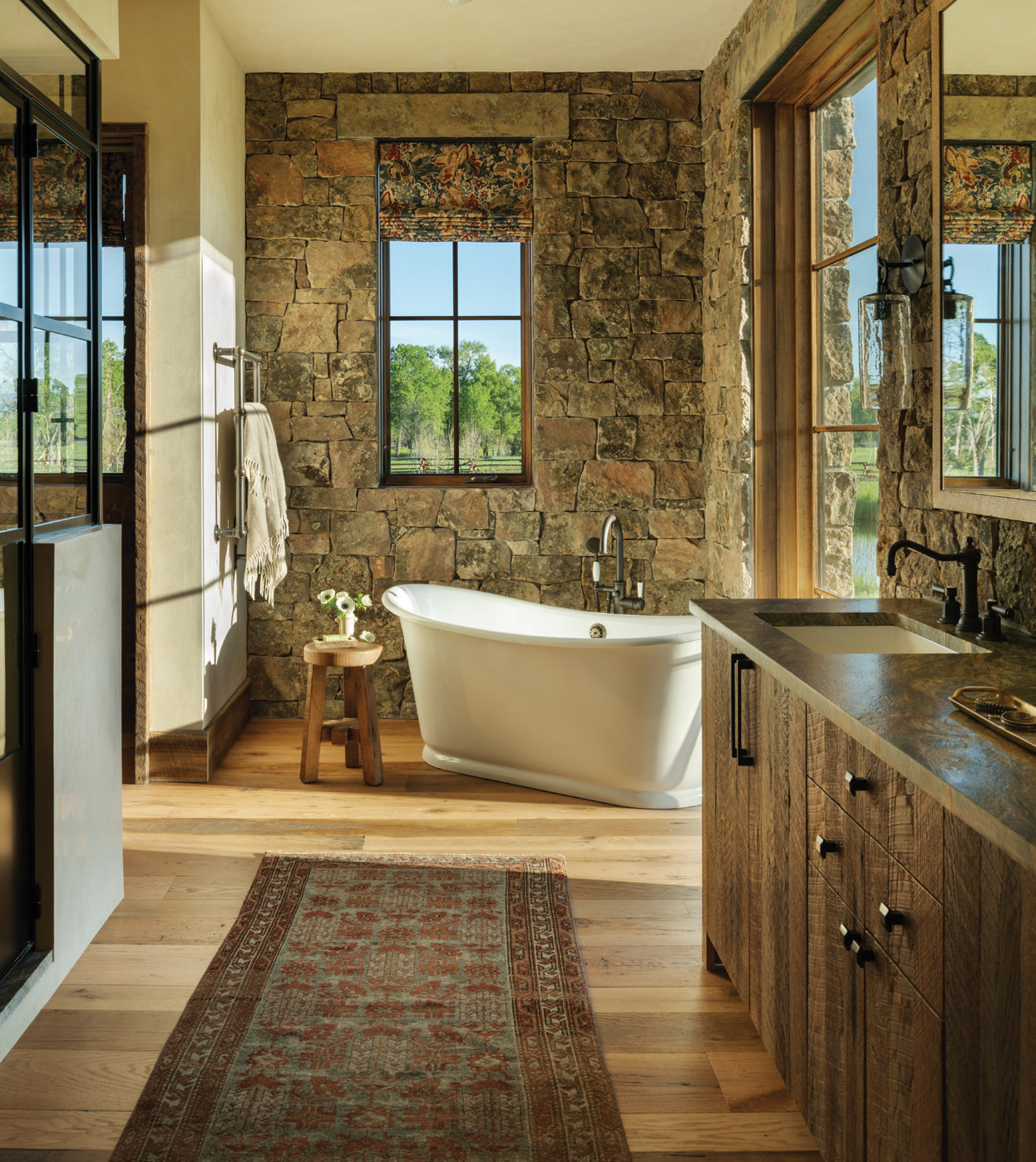 The primary bathroom juxtaposes a white vessel tub against rugged stone.