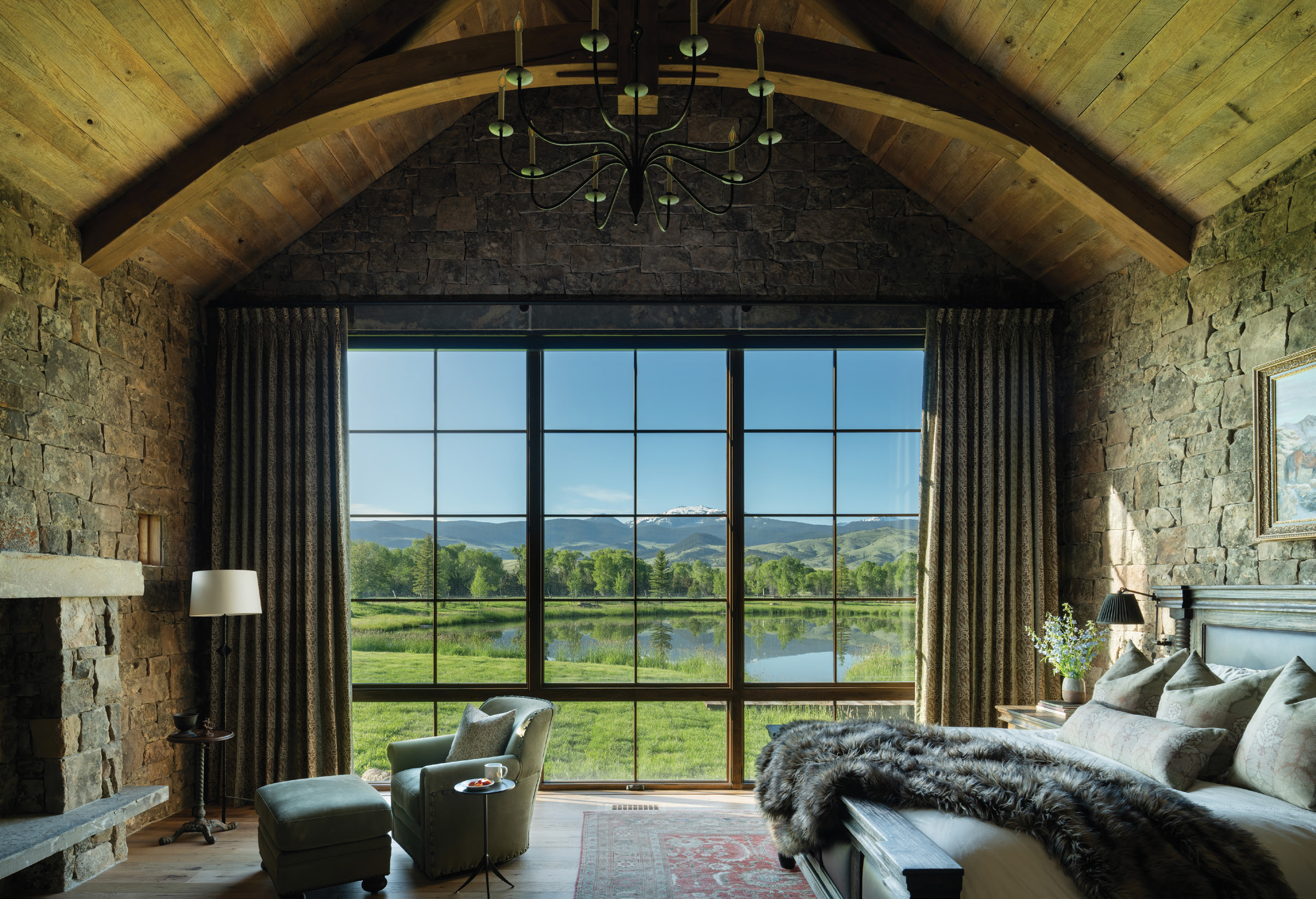 In the primary bedroom, the furniture was custom made, as was the furry coverlet for the dogs. Fedro suggested reorienting the entire room so that the intimacy within is enhanced by firelight, while the views of Brownback Mountain are unrivaled through the paned window wall. Meanwhile, the arched timber frame overhead adds a softness to the stone and steel-framed window wall.