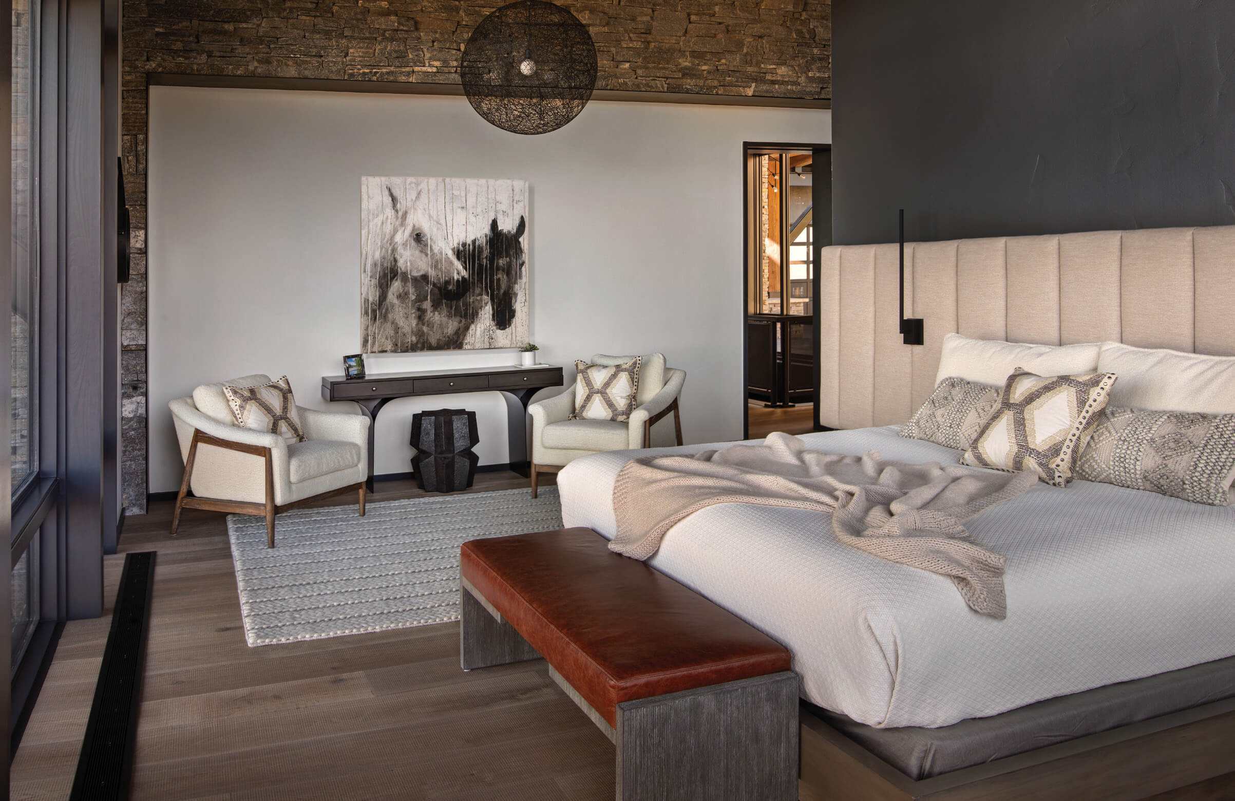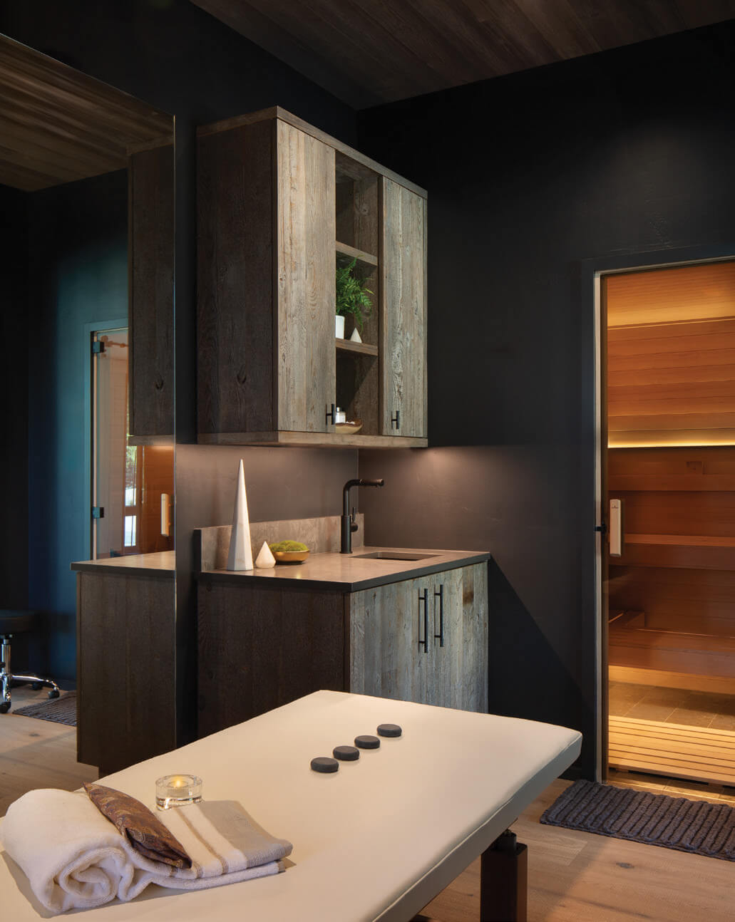 The house of seven bedrooms, including two bunk rooms, reclines with ease in the exclusive Yellowstone Club development. Fuentes says fireplaces, lounge areas, and a sophisticated air system, which, in the primary bedroom, can replicate oxygen content closer to sea level, all combine to create living spaces that fulfill all senses of the term.