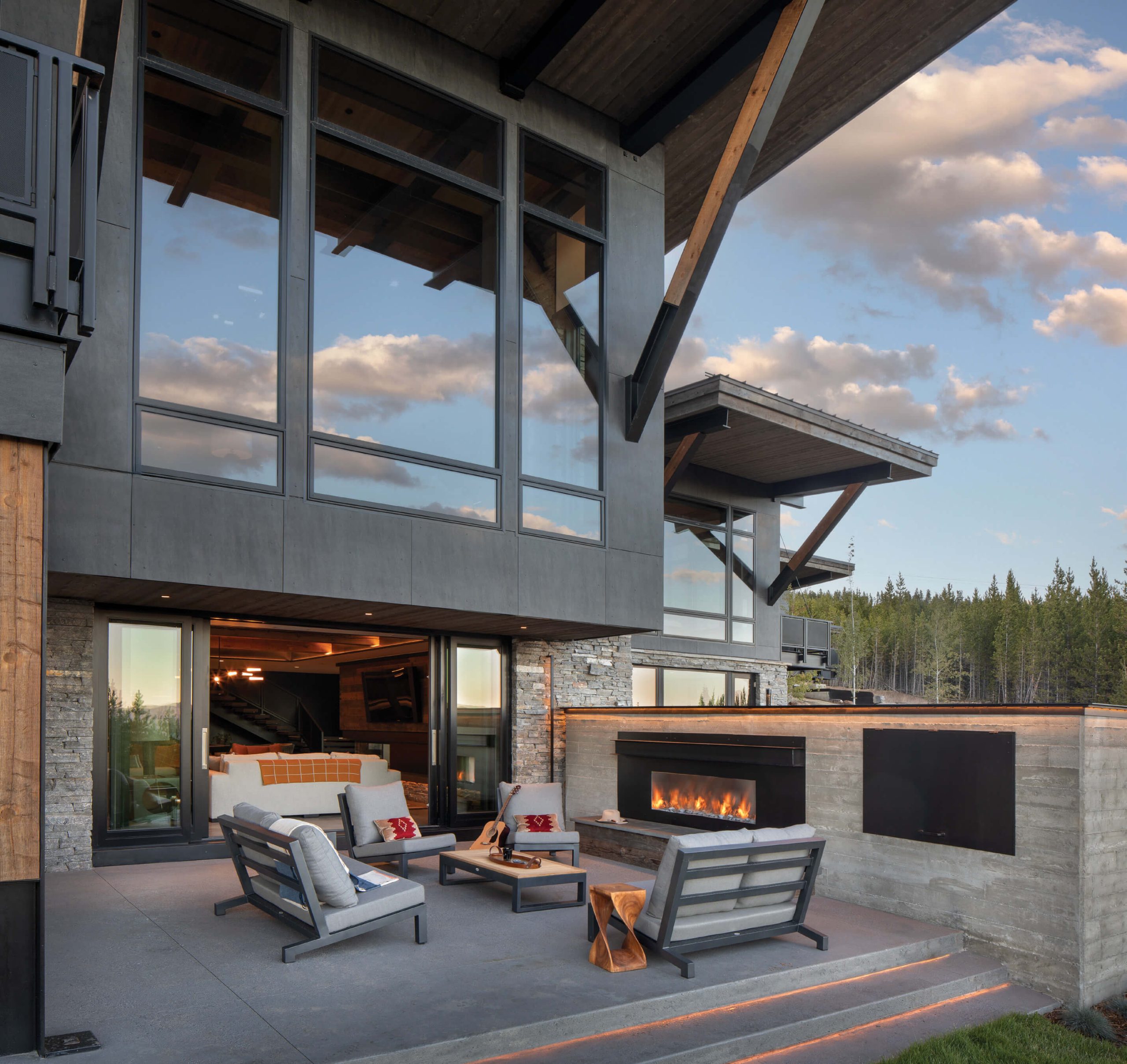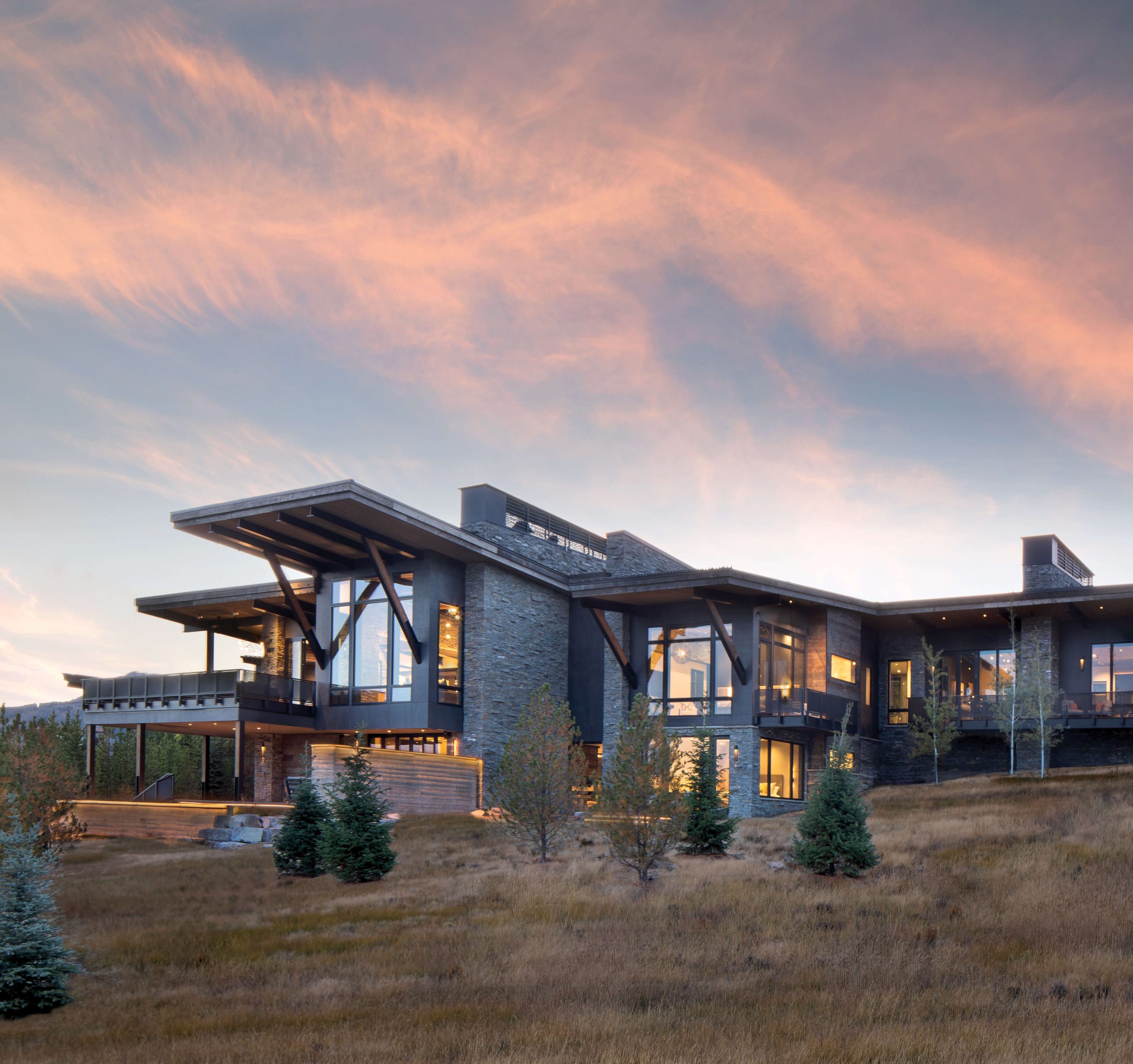 The home in Big Sky is what Jamie Daugaard, principal of Centre Sky Architecture, calls “Mountain Modern 2.0.” With offices in Montana, Utah, and Colorado, his firm has come to see structures and landscapes as interacting forms, indispensable reflections of beautiful views. And Sky Lodge — a fusion of stone, wood, metal, and glass — is less a building than an oblique-shaped sculpture that rises from a gently downsloped forest floor to swing its wings across a highly horizontal perch in a very vertical environment.