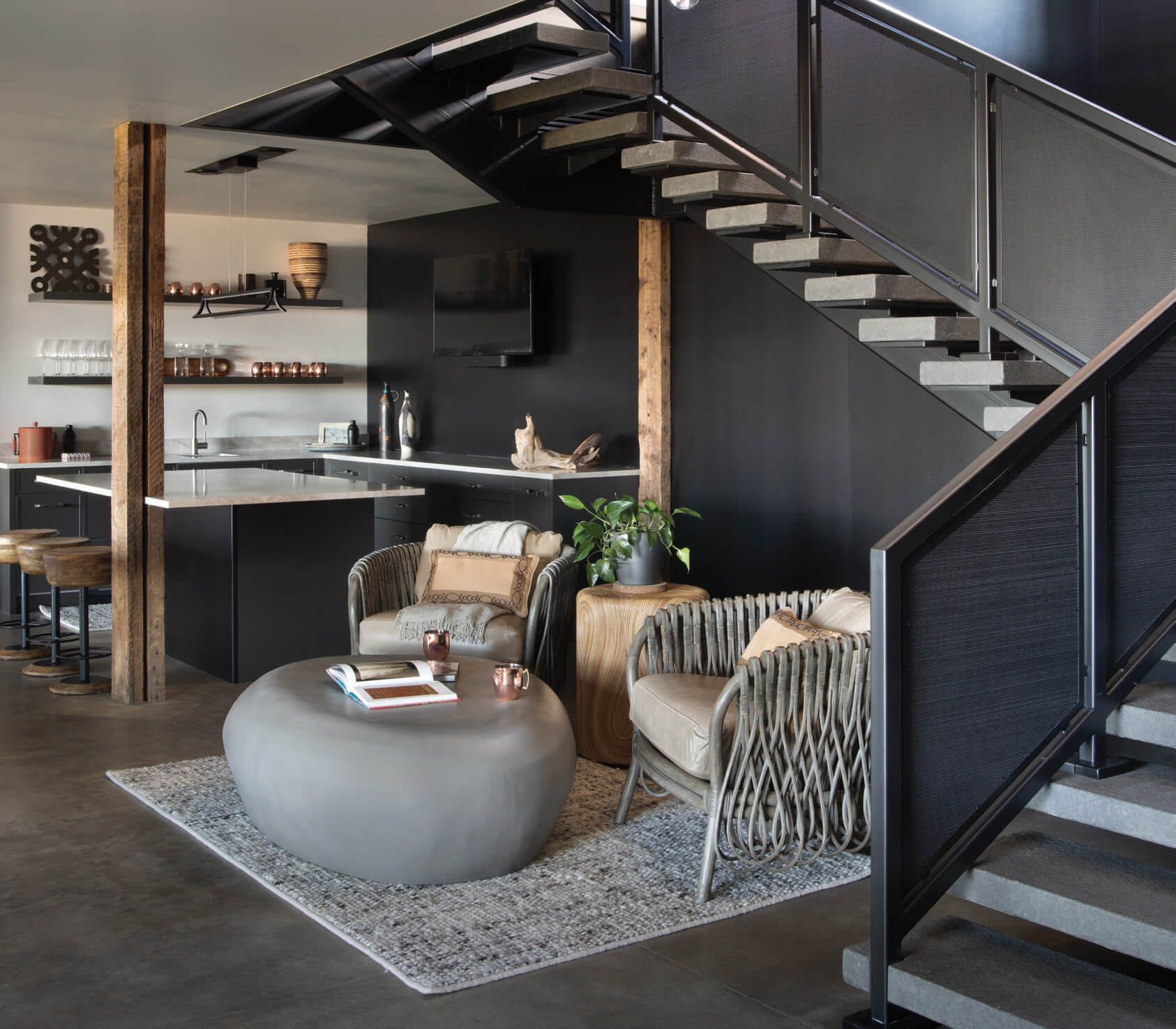 A house built for family members, guests, entertaining, and outdoor recreation led Michelle Varda, principal of The Varda Group, to draw on neutral and earthy tones and to accent friendly textiles and inviting seating areas. And because the architectural features of the house serve as elements of a painting — forms, subjects, colors, and perspectives — Varda applied a light touch. “Each house is genuinely its own outcome because it is so shaped by the client’s perspective, lifestyle, and needs,” she says. “Sky Lodge was a joy.”