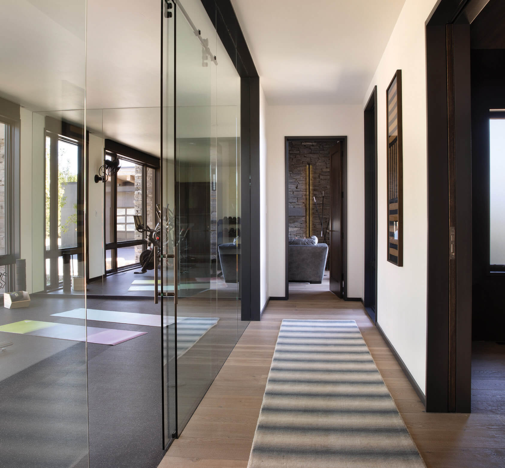 An in-home sauna and all the accoutrements of a post-workout wind down are welcome in a space that takes an oblique approach to outdoor inclusion.