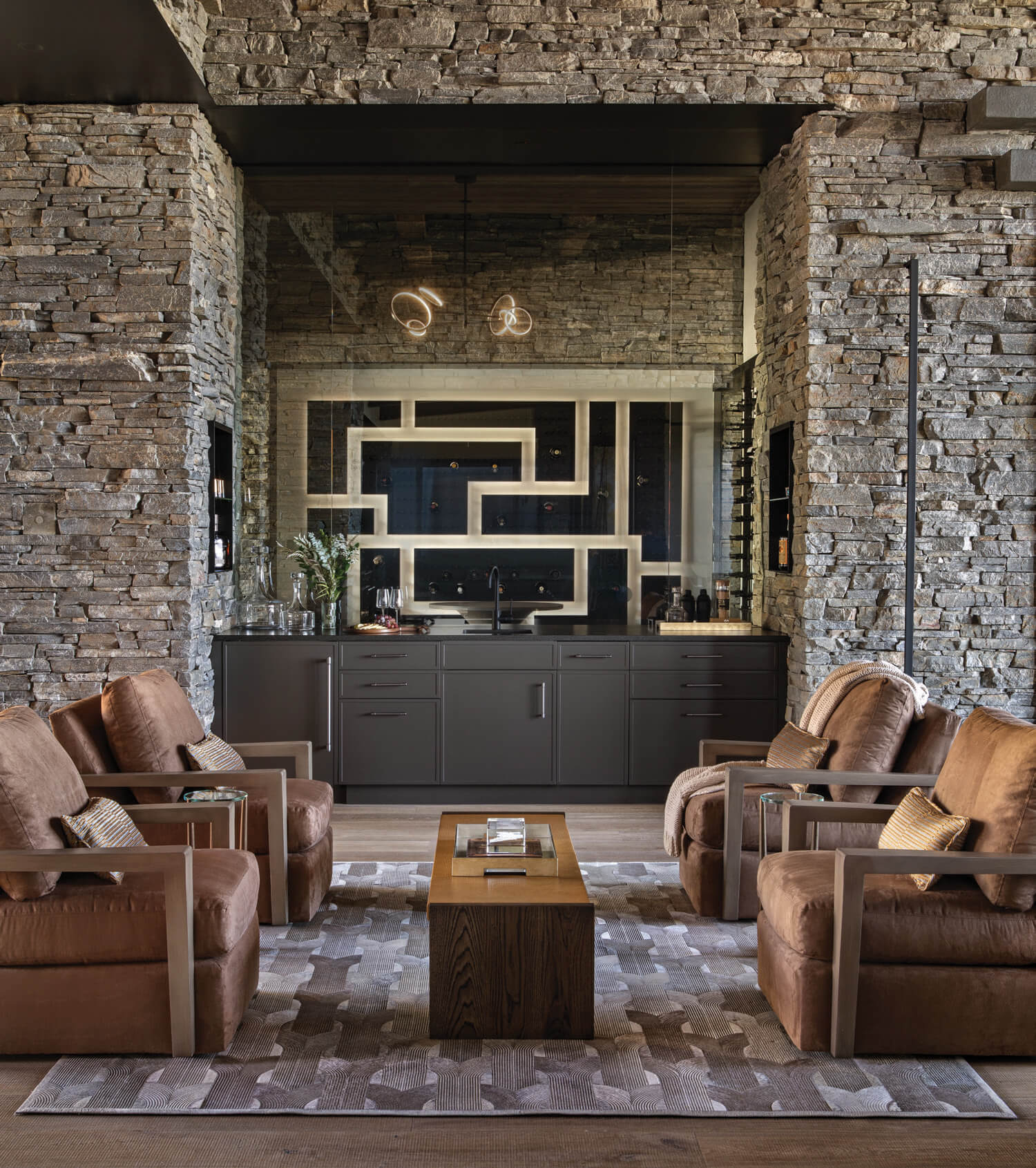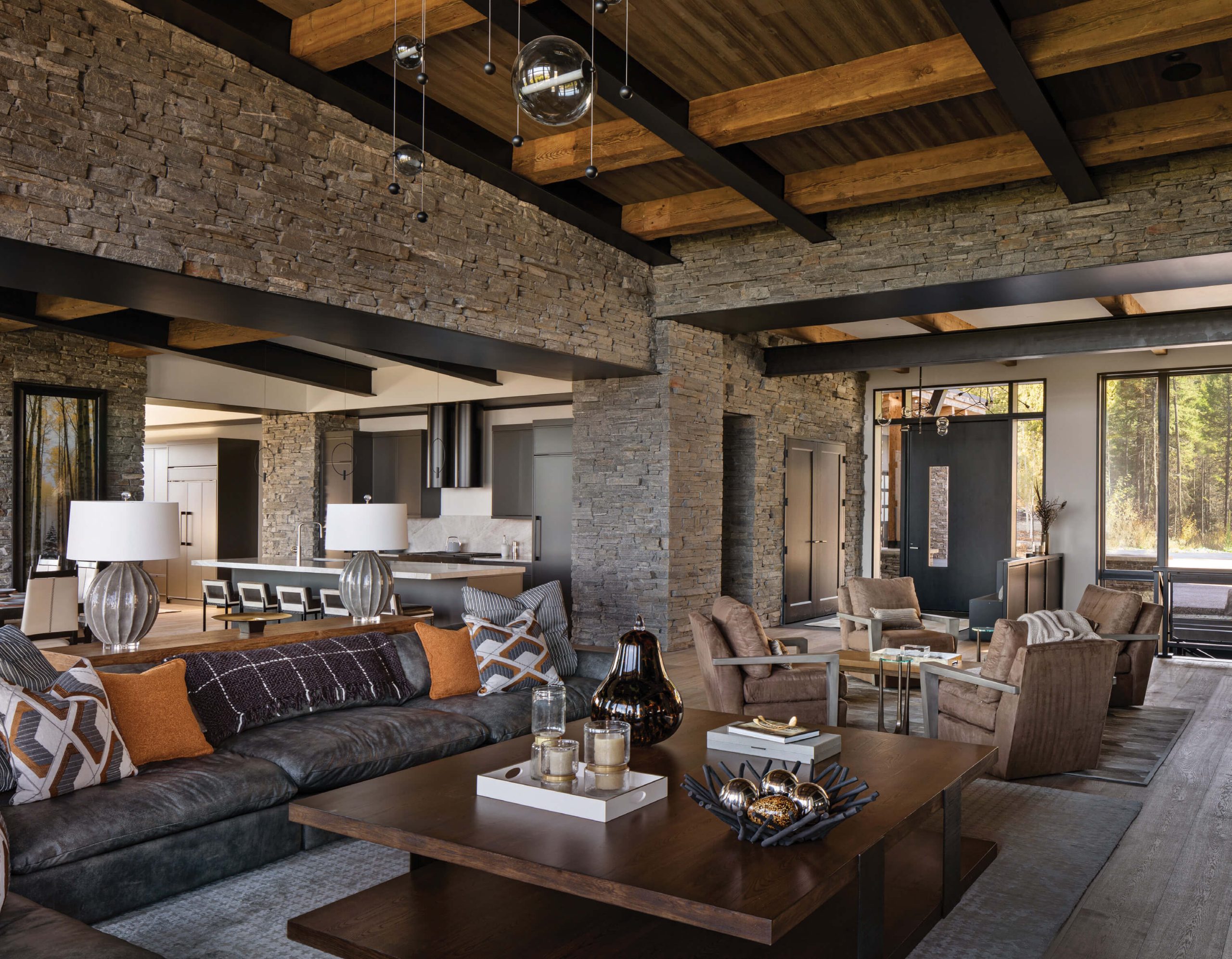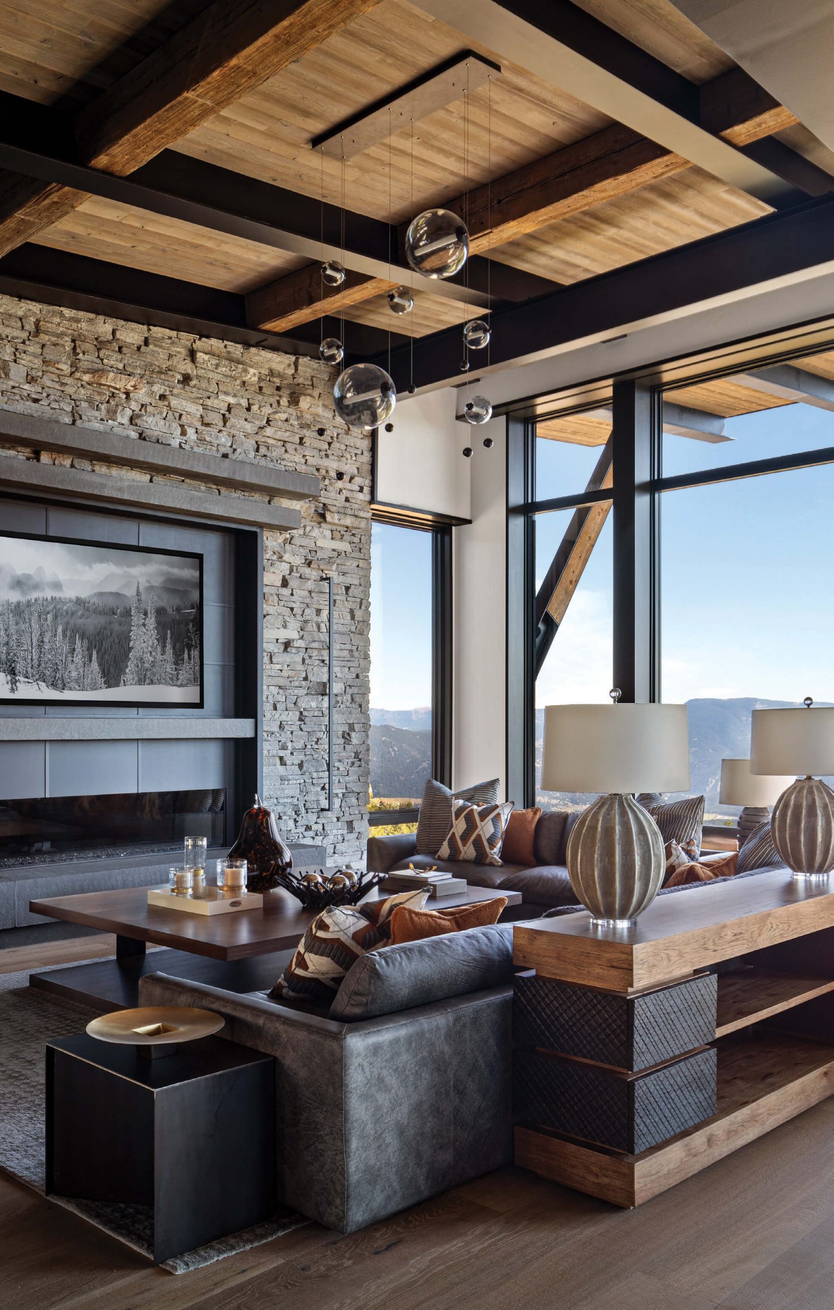 The architect worked with Teton Heritage Builders to incorporate stone spines and extended steel braces, mechanical elements that serve both aesthetic and utilitarian purposes. The latter includes everything from the hidden passage for exhaust from fireplaces to the influx of replacement fresh air.