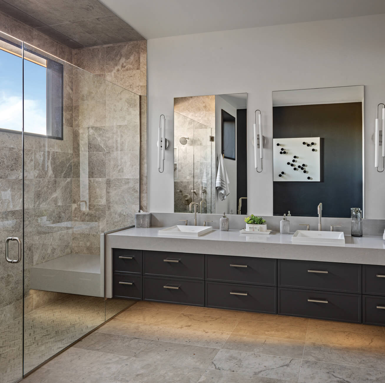 Let it never be said that any of the rooms in Sky Lodge do not speak of both utility and beauty, even the bathroom. The high, horizontal window emphasizes privacy while inviting in the kind of angled light for which the West is celebrated.